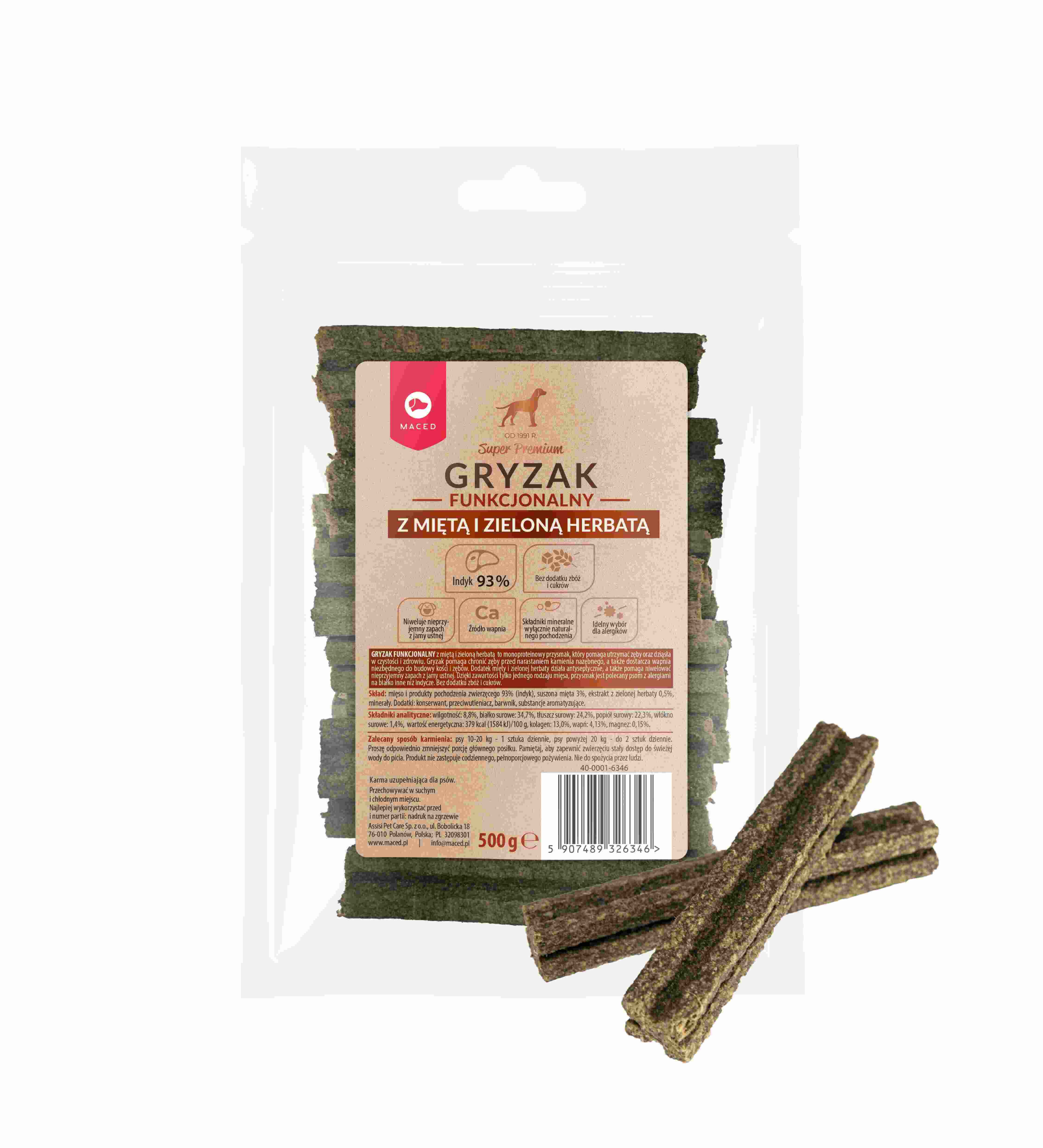 Strona główna Wszystkie Produkty Dla Psów Trenerki, Przysmaki, Gryzaki Przysmaki MACED – Gryzak Funkcjonalny – z Miętą i Zieloną Herbatą – 500g